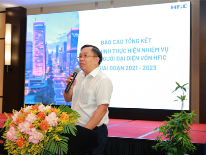 Tiếp nối chương trình, Ông Lê Văn Bắc - Phó Tổng Giám đốc Thường trực HFIC đã trình bày Báo cáo tổng kết công tác đại diện vốn, hoạt động của người đại diện vốn và người được cử giai đoạn 2021 - 2023. Báo cáo đã đưa ra cái nhìn tổng thể về những thành tựu đạt được, đồng thời thẳng thắn chỉ ra những tồn tại, hạn chế và đề xuất các giải pháp nhằm nâng cao hiệu quả công tác đại diện vốn trong thời gian tới.